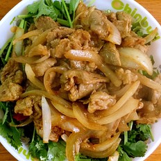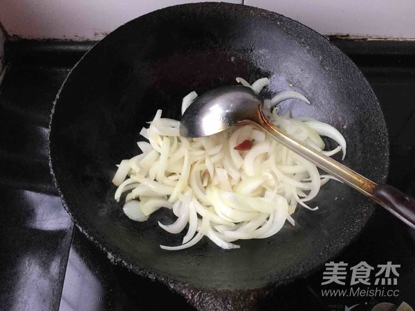 5.待羊肉片都炸完,把油過濾一下,單獨盛放,鍋子刷凈,開火燒干,放入一些炸過肉的油,倒入圓蔥煸炒2分鐘,放入炸好的肉片(肉片一定要控油。不然油乎乎的太膩),放孜然粒,加些老抽,醬油上色,嘗嘗味道,淡的話再放些鹽。