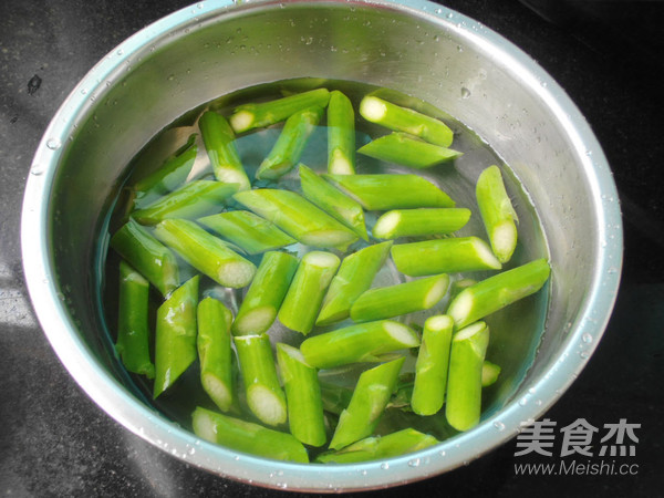 切斜段;燒一鍋開水,放進蘆筍汆湯至水再次滾開;