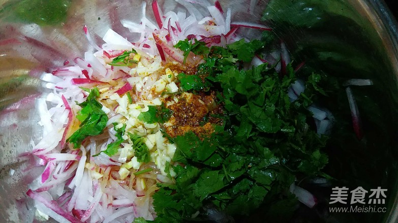 蘿卜絲盡量切細一點,蘿卜本身有股辣味,所以先用鹽腌制一會兒再放其他調料拌均勻,這樣蘿卜本來的辣味就沒那么明顯啦