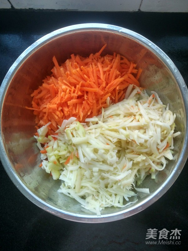 胡蘿卜,土豆,去皮洗凈擦細絲狀。