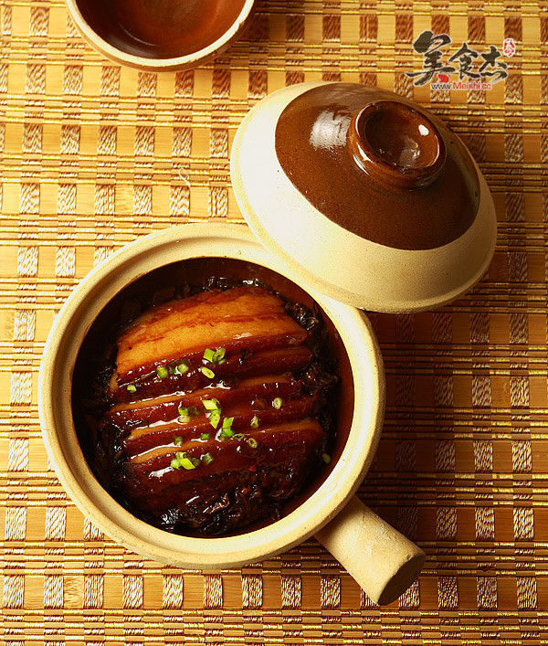 7.找一個碗,肉皮朝下碼好,然后把泡好的梅菜擠干水放在上邊弄整齊了,如果還有剩下的汁醬就全澆上去