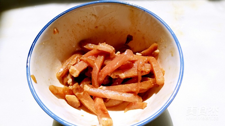 放入淀粉,鹽,砂糖,老抽,生抽腌制片刻。