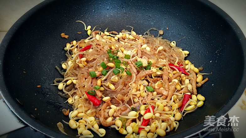 豆芽扒拉四周,中間放入肉絲煸炒變色。