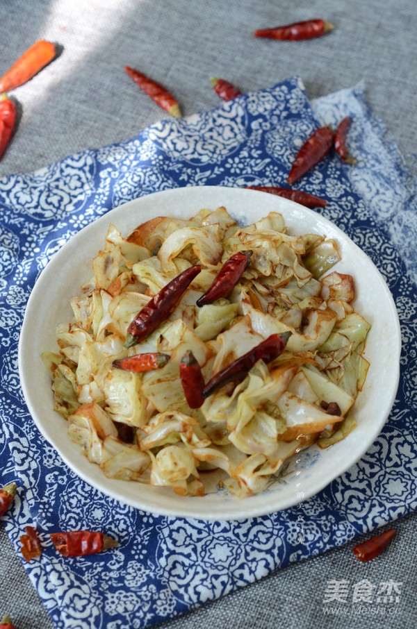 放入包菜,煸炒幾下后烹入醋,加鹽煸炒。