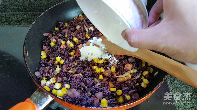 9.翻炒一分鐘左右就倒入淡奶油,繼續(xù)翻炒,使每粒飯都沾有淡奶油即可。