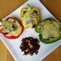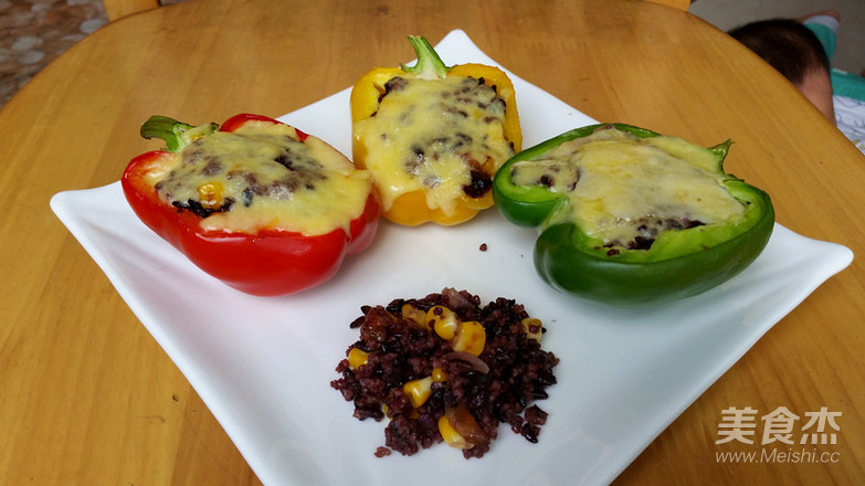 3.在煮飯期間可以處理青紅黃椒,把彩椒切半,里面的子去掉和洗干凈。