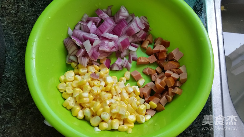 7.把玉米和脆皮腸也倒進(jìn)鍋里一起翻炒,炒得差不多就放些鹽和糖調(diào)味。