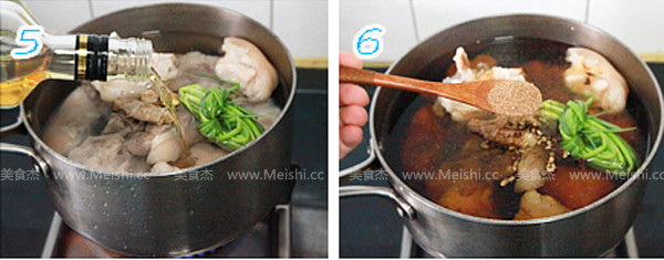 2.將焯過水的豬蹄重新放入鍋中,加入兩倍的清水,放入蔥、姜