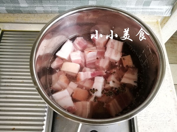 3.把切好的肉放入冷水鍋中,放幾粒花椒和丁香,去腥,水開后,繼續煮2分鐘撈出,用冷水沖掉肉表面的浮沫,瀝干水份
