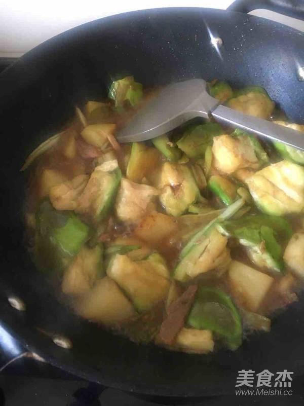 7.放完土豆5分鐘左右把茄子用手撕放入 (撕得不要太小也不要太大塊)翻炒兩分鐘。