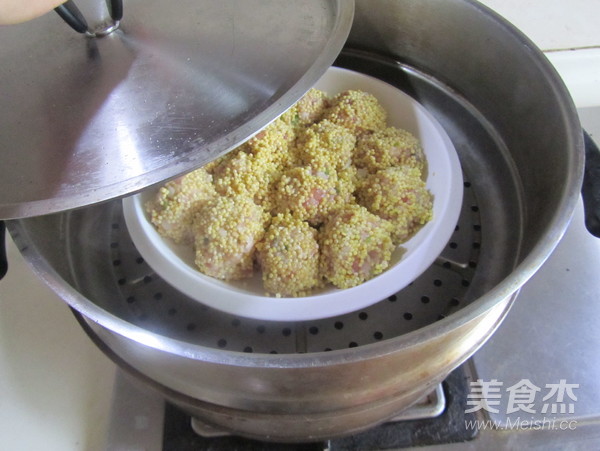 1. 小米先放入水中泡上一個小時; 2. 肉丸中加入點鹽等調味料順著一個方向攪拌上勁, 再放入蓮藕末攪拌拌均勻,再加入點鹽調味; 3. 將蓮藕肉丸均勻的裹上小米, 放在鍋上, 大火蒸上20分鐘即可。