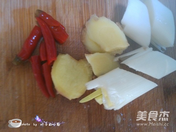 生姜切成片,大蔥切成段,泡椒切成兩段