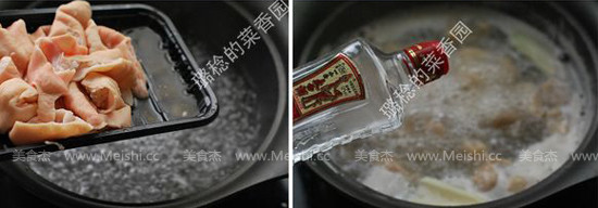 2.將大腸放入冷水鍋中,倒入2勺白酒或者料酒