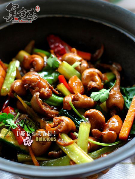 15.翻炒幾下,一點味精,關火,一盤色澤紅亮,滋味鮮香的干鍋肥腸就可以裝盤上桌了