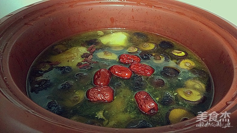 倒入燉鍋,放淘洗后擠干水份的香菇(泡發香菇的水同時倒入),放老姜顆、胡椒粒,燉兩小時;