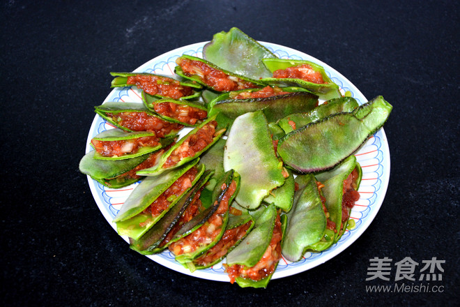 將瘦肉餡填進豬耳朵豆角里面。