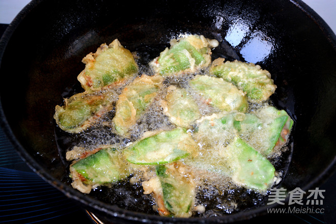 炒鍋熱油,將做好的肉餡豬耳朵豆角在面糊里粘一下裹滿面粉放進油鍋進行炸制。
