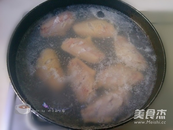 鍋里加入適量水,滴入加入適量料酒燒開(kāi),下入雞翅焯水,再次燒開(kāi)煮一分鐘撈起瀝干水分