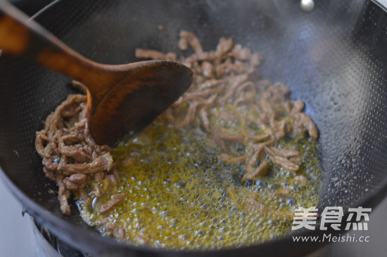 油溫7成熱倒入牛肉絲,這個油溫要比平時炒肉絲的高一點,因為最后要把肉中的水分基本炒干
