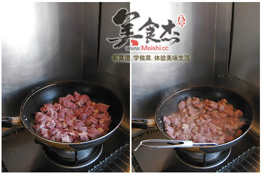 2.倒掉浸泡出的血水,將牛肉充分瀝干。鍋中加入少量油燒到3成熱,放入牛肉塊煸炒,中途會(huì)出水,此時(shí)將火力調(diào)大中火,繼續(xù)翻炒直到水分收干為止
