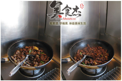 3.牛肉炒至變色、水分收干后,放入白酒、蔥段、姜片炒勻