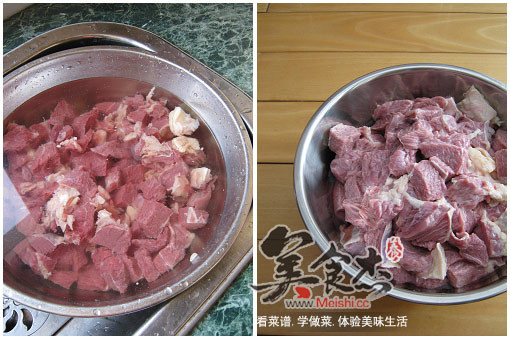 2、買回來的牛肉用清水浸泡一下,在水中放入花椒或者姜片都有很好的去腥、崔嫩的作用。浸泡之后的血水倒掉不用,而且要將牛肉充分瀝干。如果煸炒過程中牛肉出水很多,最好將水份倒掉,否則等到水分炒干,肉質(zhì)也就變得很老了。