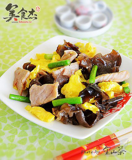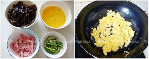 1.瘦豬肉切薄片,加少許鹽、料酒、水淀粉漿上腌制一會兒;泡發(fā)黑木耳去掉根部,撕成小塊備用;雞蛋打散,蒜薹洗凈切小段