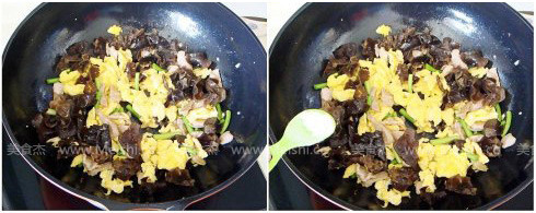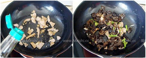4.倒進(jìn)少許生抽調(diào)味,放入木耳和蒜薹翻炒至熟
