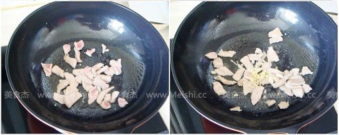 3.炒鍋重新放油加熱,將肉絲放進(jìn)去炒至變色,加入姜蒜末同炒