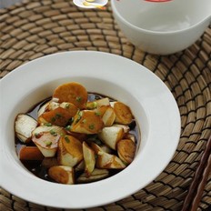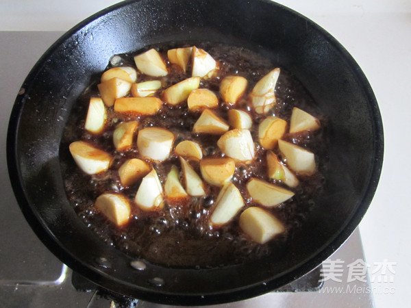 1. 茭白切成滾刀塊; 2. 用蠔油、黃酒和生抽一起燉煮,因為這都有些咸味,所以后面加入鹽的量要少點。