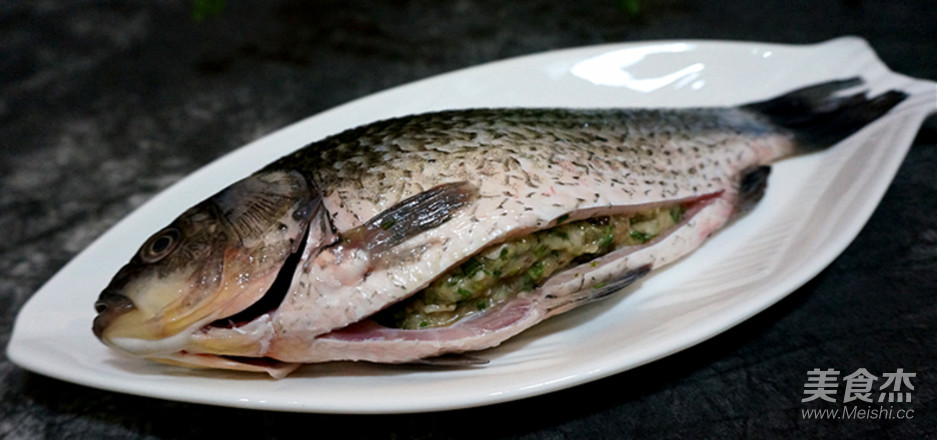 魚肚子里塞滿肉餡兒,用勺子押一下