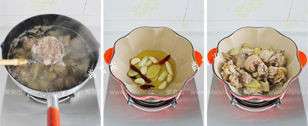 4.大火燒開后繼續(xù)煮3分鐘,撇凈上面的浮沫,然后將雞塊撈出控水待用