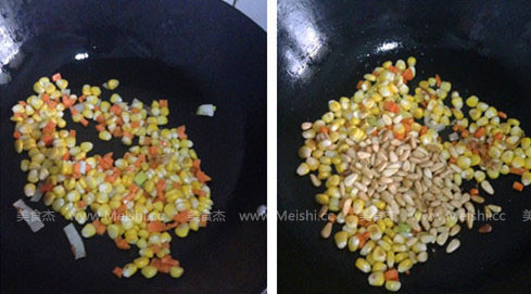 4.最后倒入松子仁,放鹽、白糖、淋香油即可,盛出后撒香蔥碎裝飾