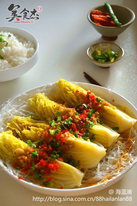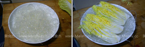 4.泡軟的粉絲鋪在盤(pán)底,擺放娃娃菜