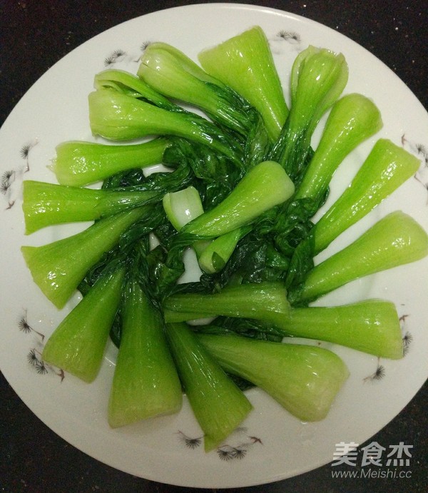6.炒鍋點火入油燒熱,蒜片爆香,入油菜煸炒,調入少量鹽,味精調味后出鍋。