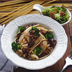 盛起蔓越莓肉醬意大利面,放進西蘭花,即可食用