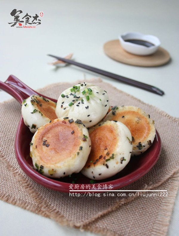 24.打開鍋蓋,轉小火,再淋入少許油,將包子煎至底部金黃酥脆;最后撒入芝麻與蔥花即可