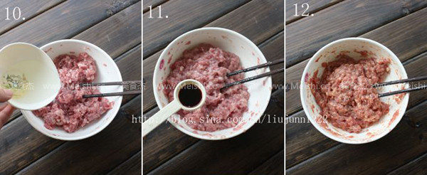 2、制作肉餡時,往肉餡中打入一些蔥姜水,吃起來會鮮嫩多汁。打水的時候,要少量多次地加入,即倒入少量的水先攪勻然后再加,不要將水一下子全部倒入。一定要注意要朝一個方向攪拌,這樣才能將水完全打入肉餡中使之上勁;