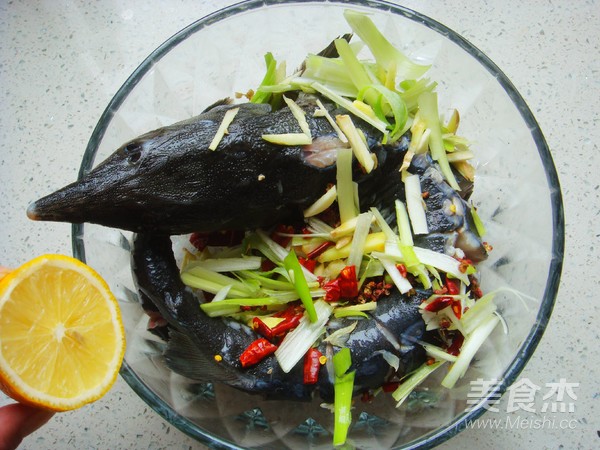 1.鱘魚清洗干凈,魚身兩側切幾刀。蔥姜切絲,辣椒切小段備用。